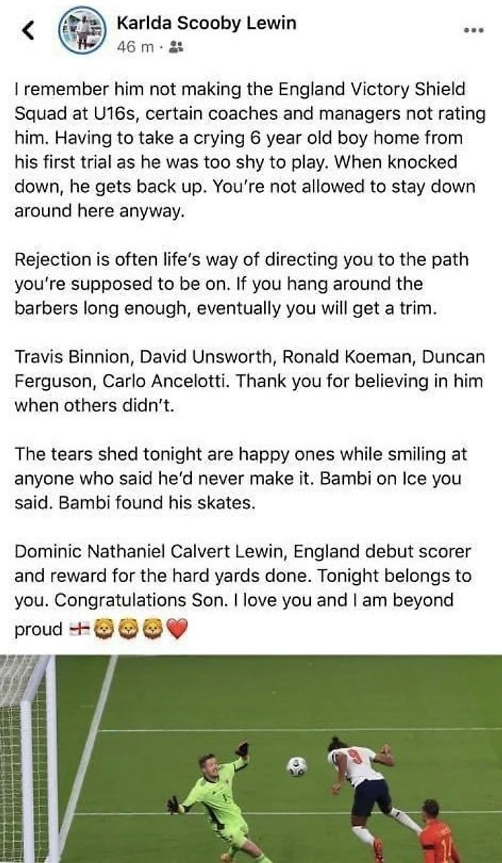 Доминик Натаниэль Кэлверт-Льюин забил за сборную Англии в первом же матче. Это награда за все его старания. Сегодняшний вечер принадлежит тебе. Поздравляю, сын! Я люблю тебя – и я не могу гордиться тобой больше, чем сейчас!»