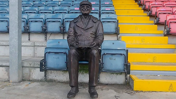 Но на трибуне скромненького 10-тысячного стадиона «Краун Ойл» появился памятник не кому-то из них, а простому болельщику Дэвиду Клафу. Смотрите, какой улыбчивый симпатяга – в руках у него, кстати, программка.