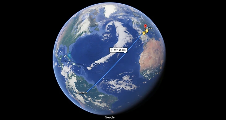 • Потом Лукаса ждал перелет Манаус – Лион. 8347 км и 19 часов 30 минут в воздухе – если верить Google Maps.