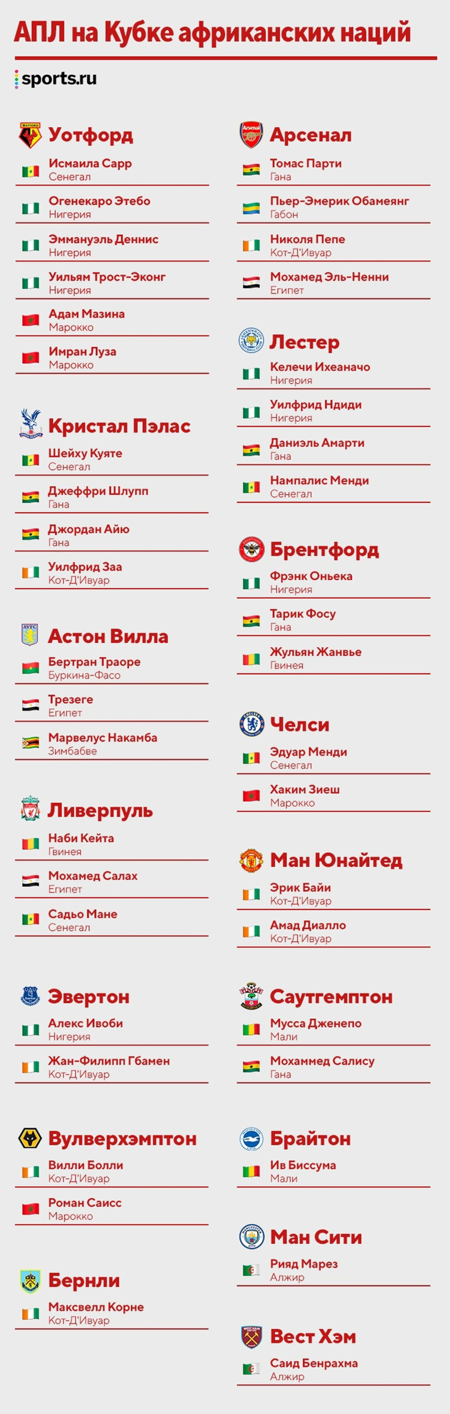 В лучшем случае эти игроки должны пропустить два матча, в худшем (со всеми карантинами по прилету в Африку и оттуда) – восемь игр (6 туров АПЛ и 2 раунда Кубка Англии).