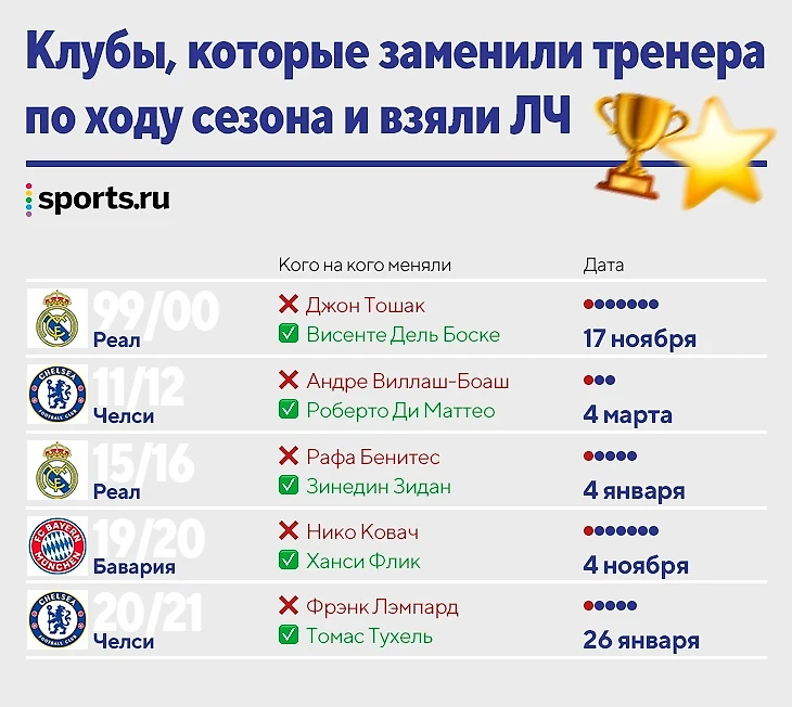 • У Томаса Тухеля уже есть чемпионский опыт. Но тогда немец приходил в «Челси» в январе. Назначение в «Баварию» случилось 24 марта – только Ди Маттео приходил в марте и взял ЛЧ. Позднее чемпионских рокировок не было.