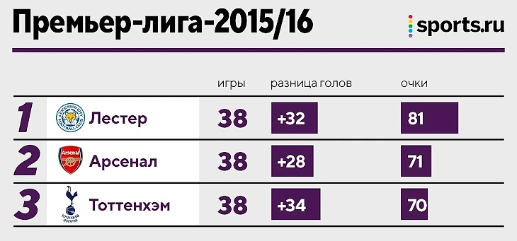 Сама гонка тут не была особенно напряженной. «Лестер» оформил чемпионство за 2 тура до финиша. Но сам факт, что команда, вероятность чемпионства которой в начале сезона оценивали как 5000 к 1, обошла всю топ-6 и затащила титул... Ну как без этого?