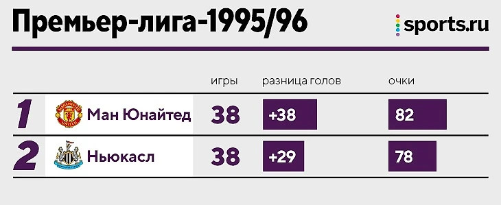 Соперник у «Ман Юнайтед» в том сезоне был очень серьезный. «Ньюкасл Юнайтед» Кевина Кигана провел на первой строчке 212 дней (с 1-го по 33-й туры) – это до сих пор рекорд для команды, которая в итоге не стала чемпионом.