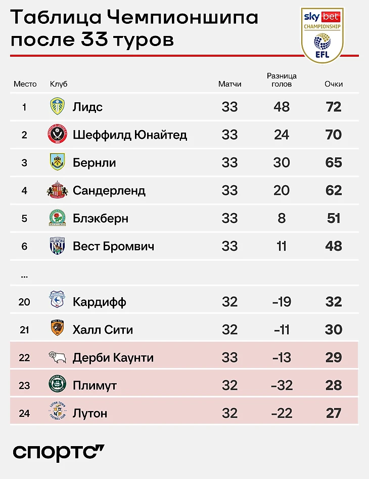 «Дерби Каунти» в зоне вылета, опустились после 0:4 от КПР в прошлом туре. Ниже пока только «Плимут», после увольнения Руни выбивший из Кубка Англии «Ливерпуль», и «Лутон», еще в прошлом году игравший в АПЛ. Но у них на матч меньше, то есть по потерянным очкам «Дерби» сейчас – худшая команда Чемпионшипа.