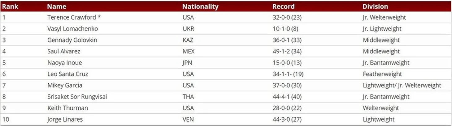 Идущие выше Сисакет и Кит Турман также не выглядят сильными кандидатами на место в первой 10-ке - особенно Турман, который, по его же словам, хочет в этом году "вернуться" (куда собственно?). В отличие от чемпиона мира по двум версиям, который уже сейчас победил трех бывших чемпионов мира (двух небитых, отобрав у них чемпионские регалии). Усик уже сегодня должен быть в десятке, а победитель WBSS - на рубеже двух пятерок.