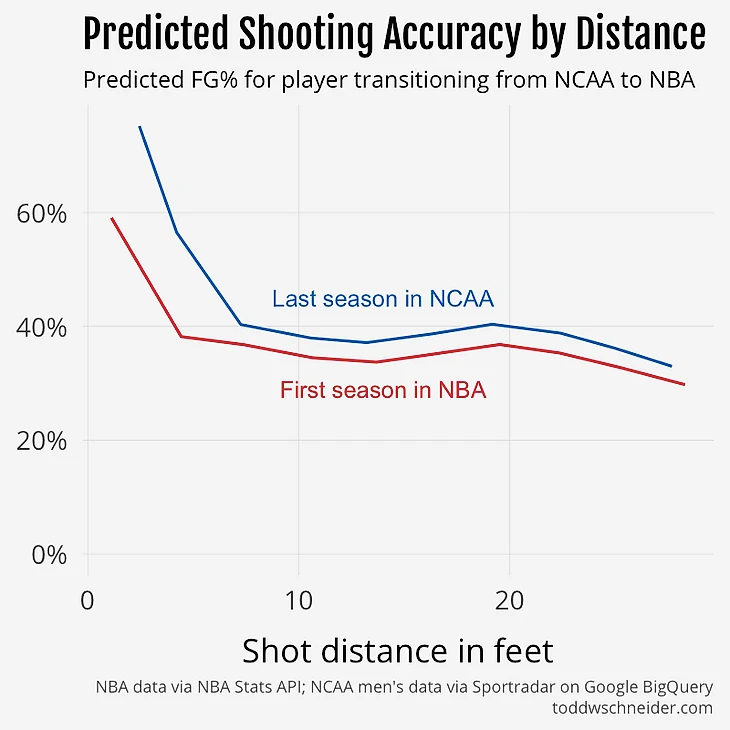 Помимо этого не стоит забывать, что уровень игроков в НБА и НСАА разный. В НБА собраны лучшие из лучших в то время как в каком-нибудь университете Саванна Стейт уровень игроков как на первенстве Тверской области. Сильнее игроки >> сильнее защита >> сложнее броски >> ниже реализация. В прошлом году Тодд Шнайдер показал, что точность броска у игроков в первом сезоне в НБА стабильно ниже, чем в выпускном классе университета на любой дистанции от кольца, особенно в краске. Так что эта беда не только снайперов, которым приходится делать броски на метр дальше.
