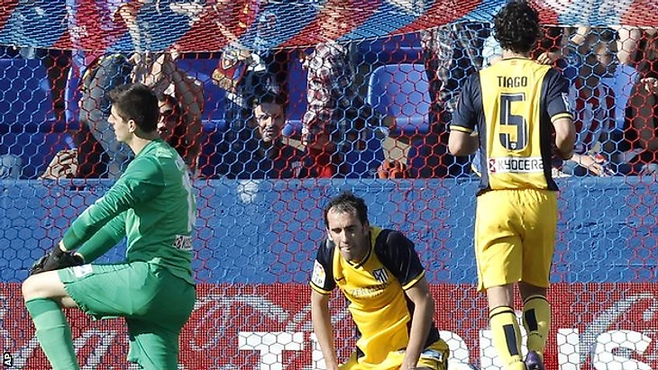 Выезд к "Леванте", состоялся через четыре дня после тяжелейшей в физическом и эмоциальном планах ответной игры в "Челси". Игроки не сумели восстановиться, тем более хозяевам повезло быстро открыть счет (автогол Филипе). Да еще и госпожа удача решила не баловать излишне "атлетов": чего стоят только непопадание Вильи в пустые ворота, промах Косты с трех метров, попадание Адриана в штангу. Там же, где мяч шел в створ, на его пути неизменно вставал "левантийский" кипер Кейлор Навас, проведший, наверное, лучшщий матч в сезоне. Так и не забив гола, "Атлетико" пропустил еще один гол в редкой хозяйской контратаке. Но не было бы счастья, несчастье-то помогло: "Барселона" на последних минутах пропускает гол от скромного "Хетафе" и теряет дома два очка. Изможденный Лигой чемпионов "Реал" в гостях играет вничью с "Валенсией", а через три дня мечтающие о "десиме" "галактикос" вновь сыграют вничью с "Вальядолидом" и выбывают из чемпионской гонки.