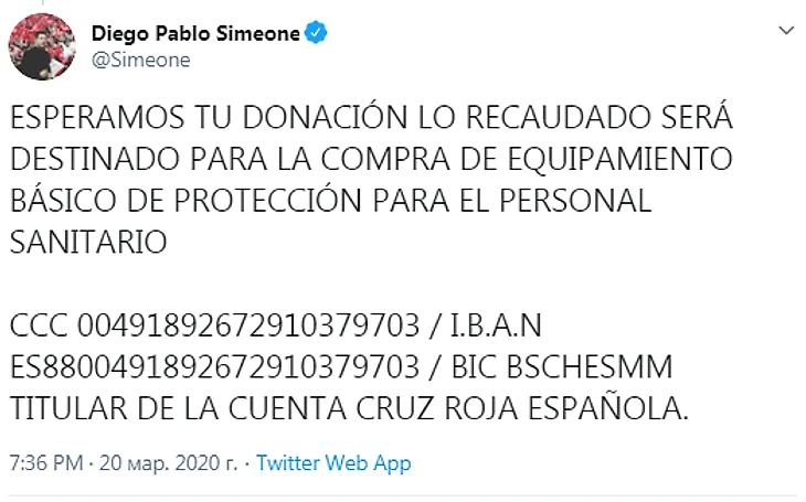 Симеоне совместно с представителем испанского "Красного креста" начал сбор средств на борьбу с коронавирусом в Испании