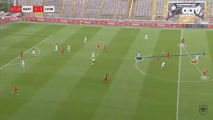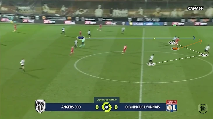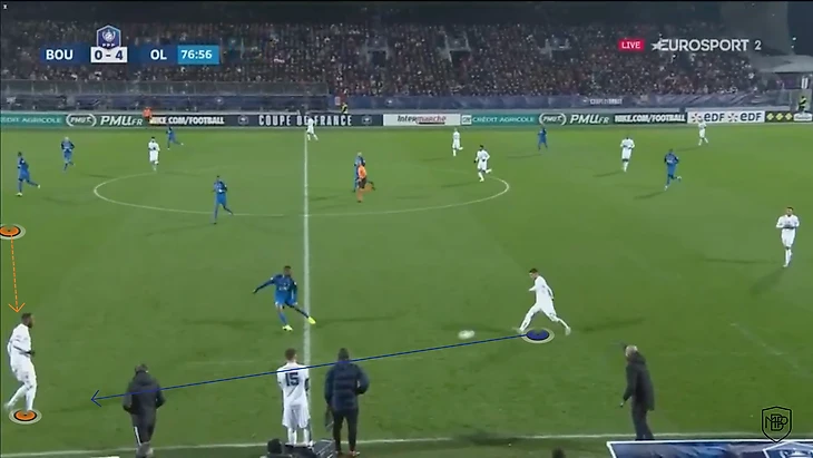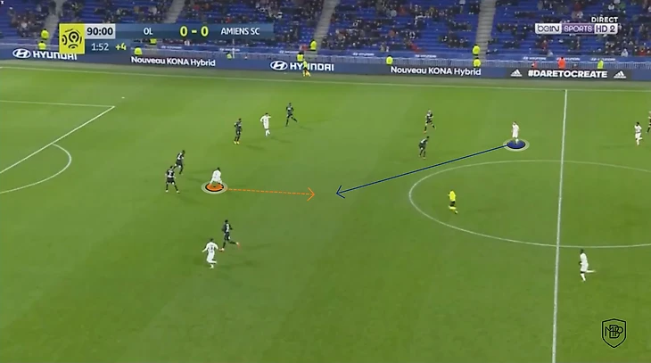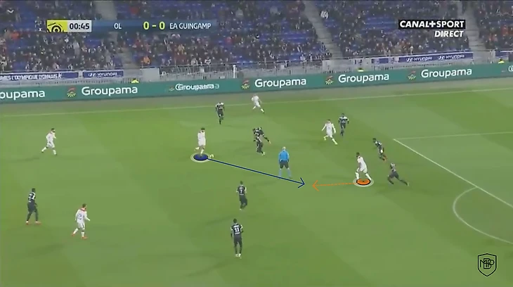 Он оттягивает чуть ниже последнего защитника в линии и опорник часто не успевает опуститься ниже, благодаря чему создается разрыв между линиями, где появляется пространство для того, чтобы отыграться с соперником и вывести самого Дембеле на ударную позицию.