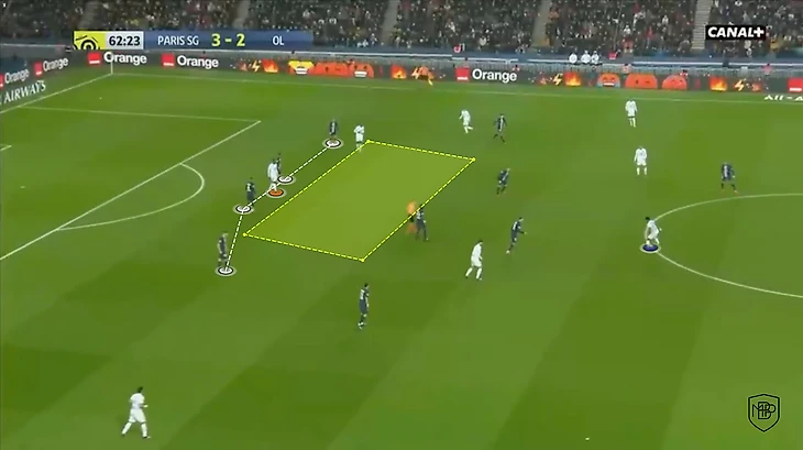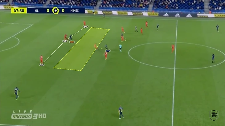 Опорники часто располагаются спиной к Дембеле и стоят диагонально, что позволяет форварду увидеть возможность для того, чтобы получить пас от своего партнера. После чего он может развернуться и создать весьма опасную ситуацию у ворот соперника, отдать передачу либо же пробить самому.