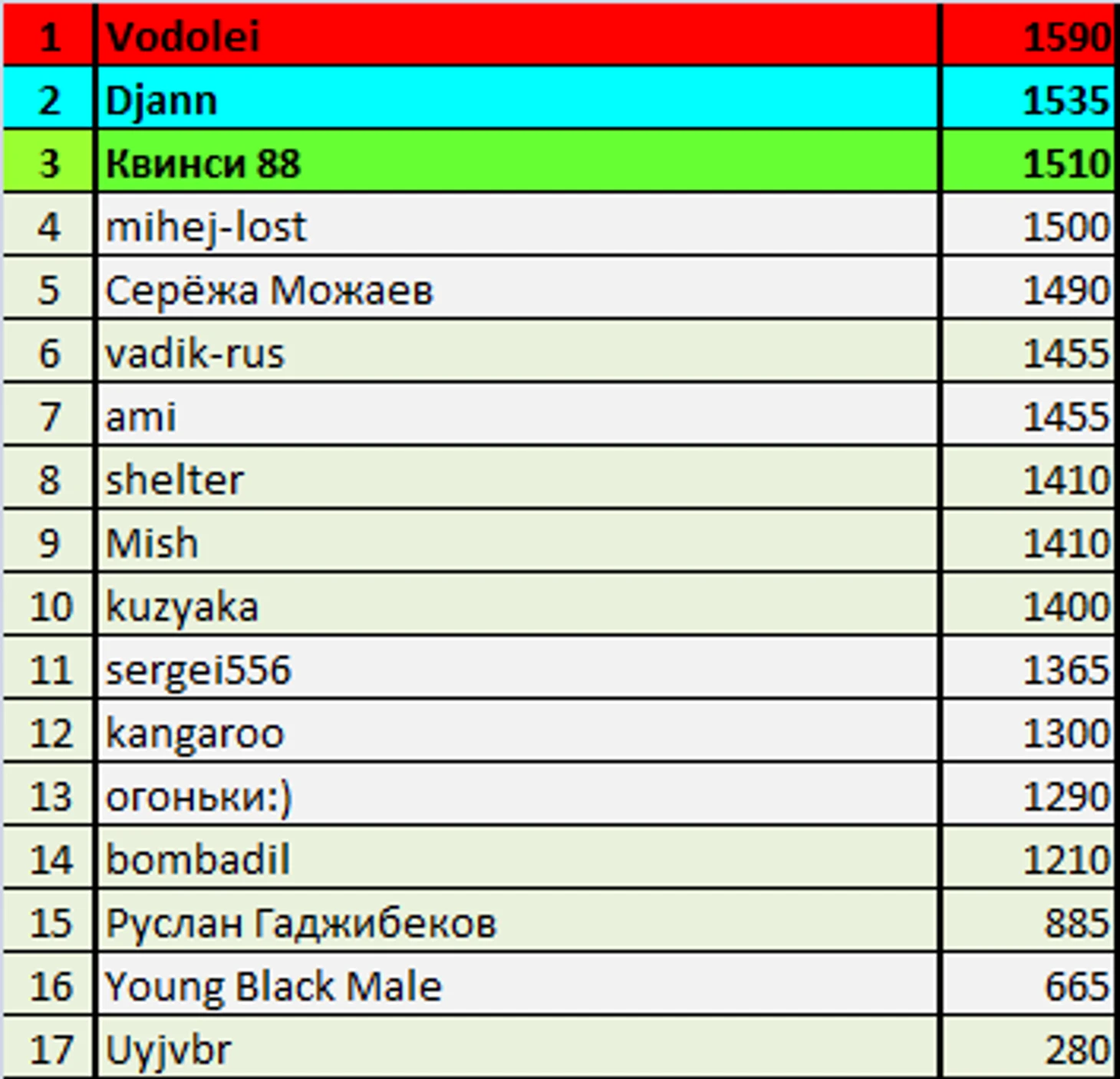 На этой неделе самый результативный скачок вверх на 2 пункта совершил Влад (shelter), что в итоге позволило ему войти в топ-8.Только что вошедший в восьмерку на прошлой неделе Руслан Гаджибеков на этой неделе её покинул, -5 позиций и 11 строчка рейтинга.