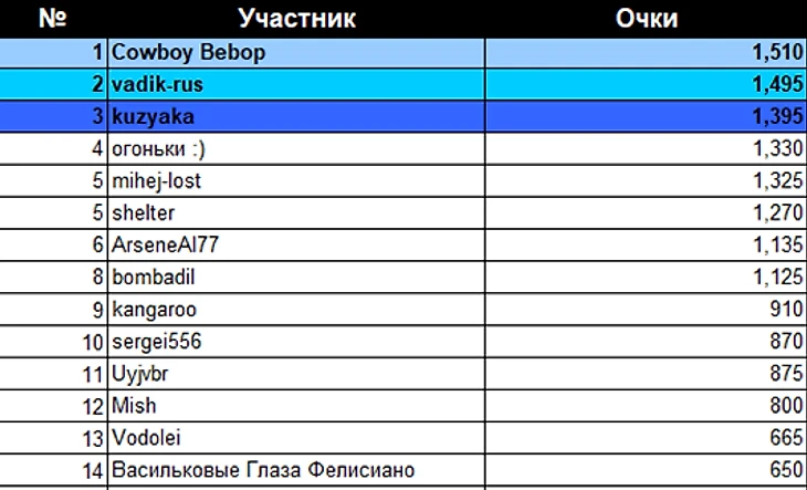 Победителям 12-го тура становятся Cowboy Bebop Поздравляю!