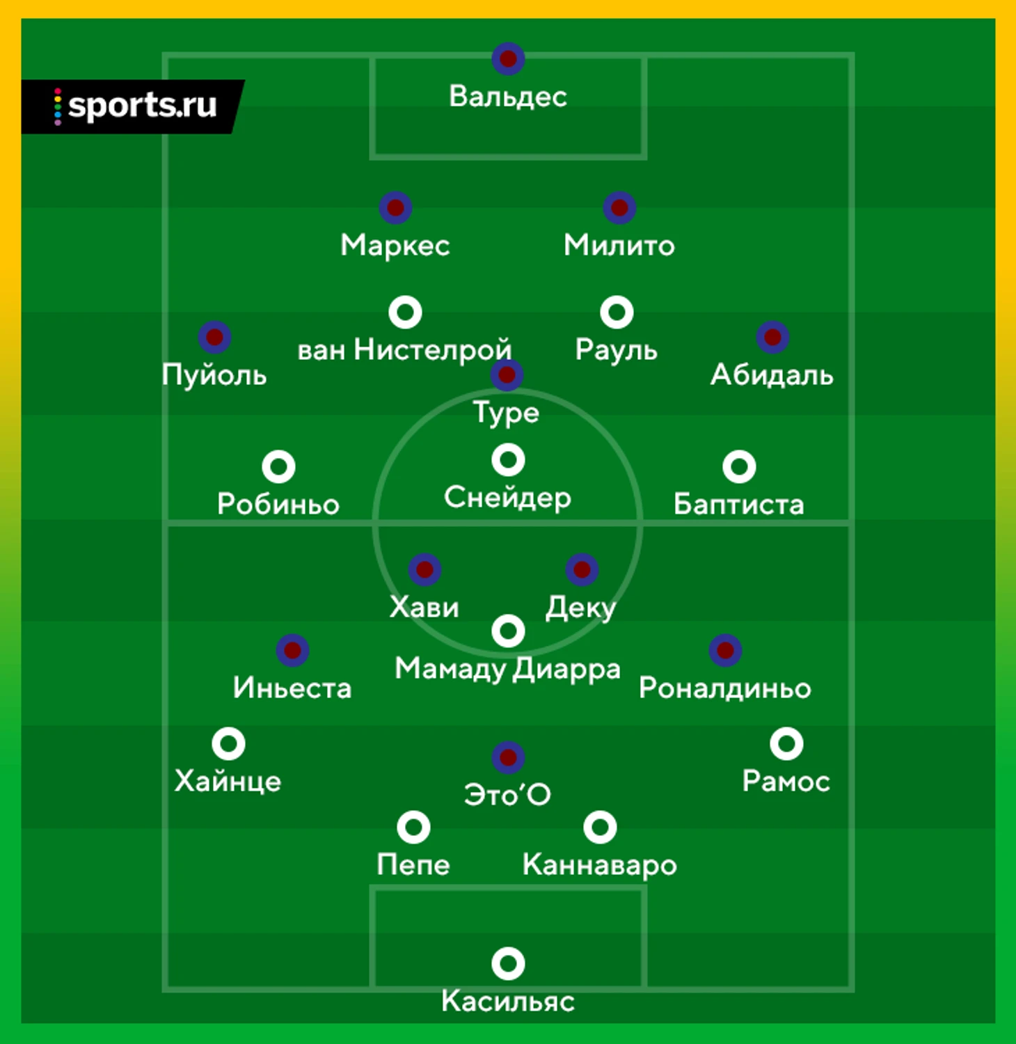 У Шустера не было проблем с составом перед матчем на «Камп Ноу». Правда, немного трясло фланги защиты (Рамос иногда играл авантюрно, а Хайнце проваливался в неожиданные моменты), но Рауль, Робиньо, Снейдер и ван Нистелрой были готовы исправить и не такое.