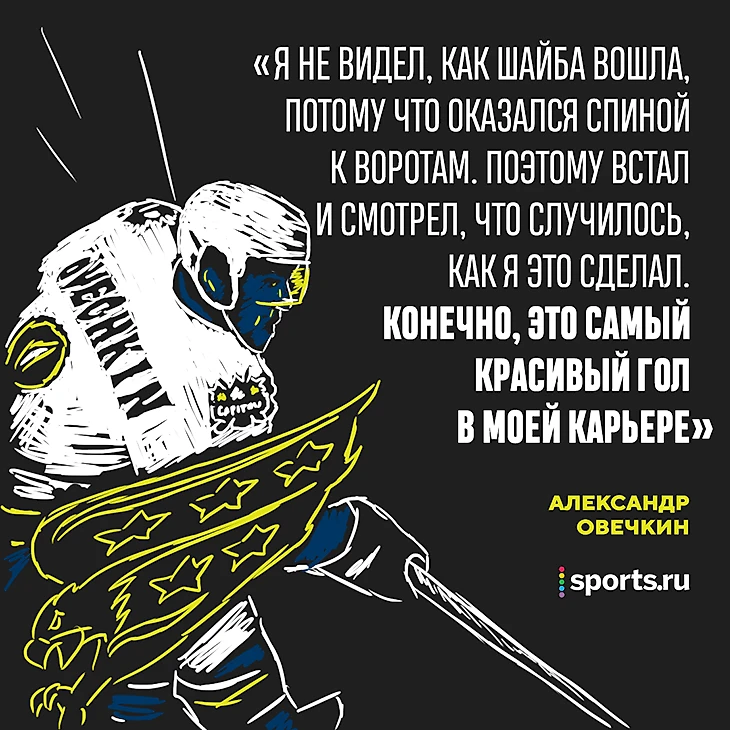 На самом деле Ови пролетел с шайбой больше половины площадки, перед воротами потерял равновесие, упал на спину и абсолютно магическим способом попал в сетку в тот момент, когда шансов забить уже не было.