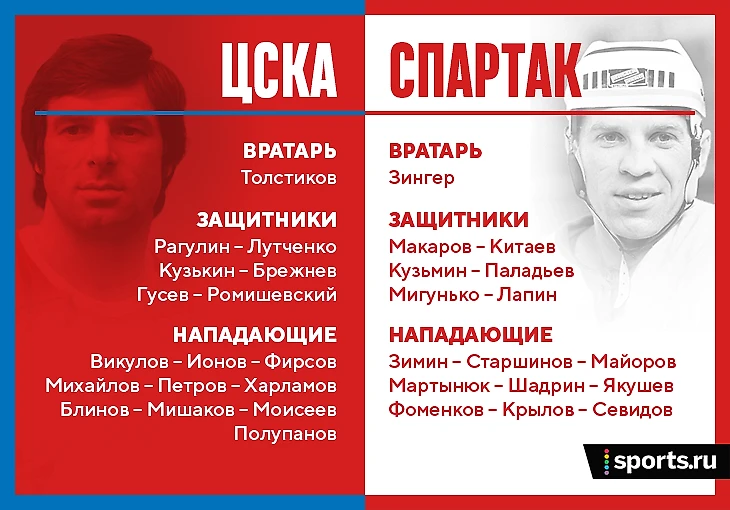 Газеты и болельщики трепетали в ожидании. За ЦСКА были титаны советского хоккея Рагулин, Фирсов, Кузькин и собранная только в этом сезоне, но уже гремевшая в Союзе тройка Михайлов – Петров – Харламов. За «Спартак» – ветераны Старшинов (он забил свой 300-й гол в том сезоне), Борис Майоров и Зингер, а также молодые суперталанты Зимин и Якушев (забил 50 голов в том сезоне).