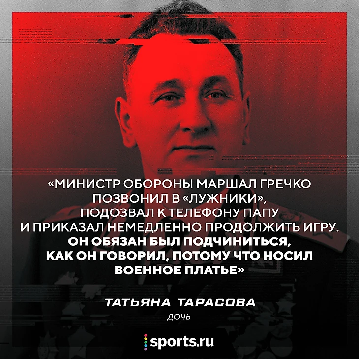 Татьяна Тарасова вспоминала: «В ситуацию вмешался министр обороны маршал Гречко. Он позвонил в Лужники, подозвал к телефону папу и приказал немедленно продолжить игру. Отец обязан был подчиниться, как он говорил, только потому, что носил военное платье».