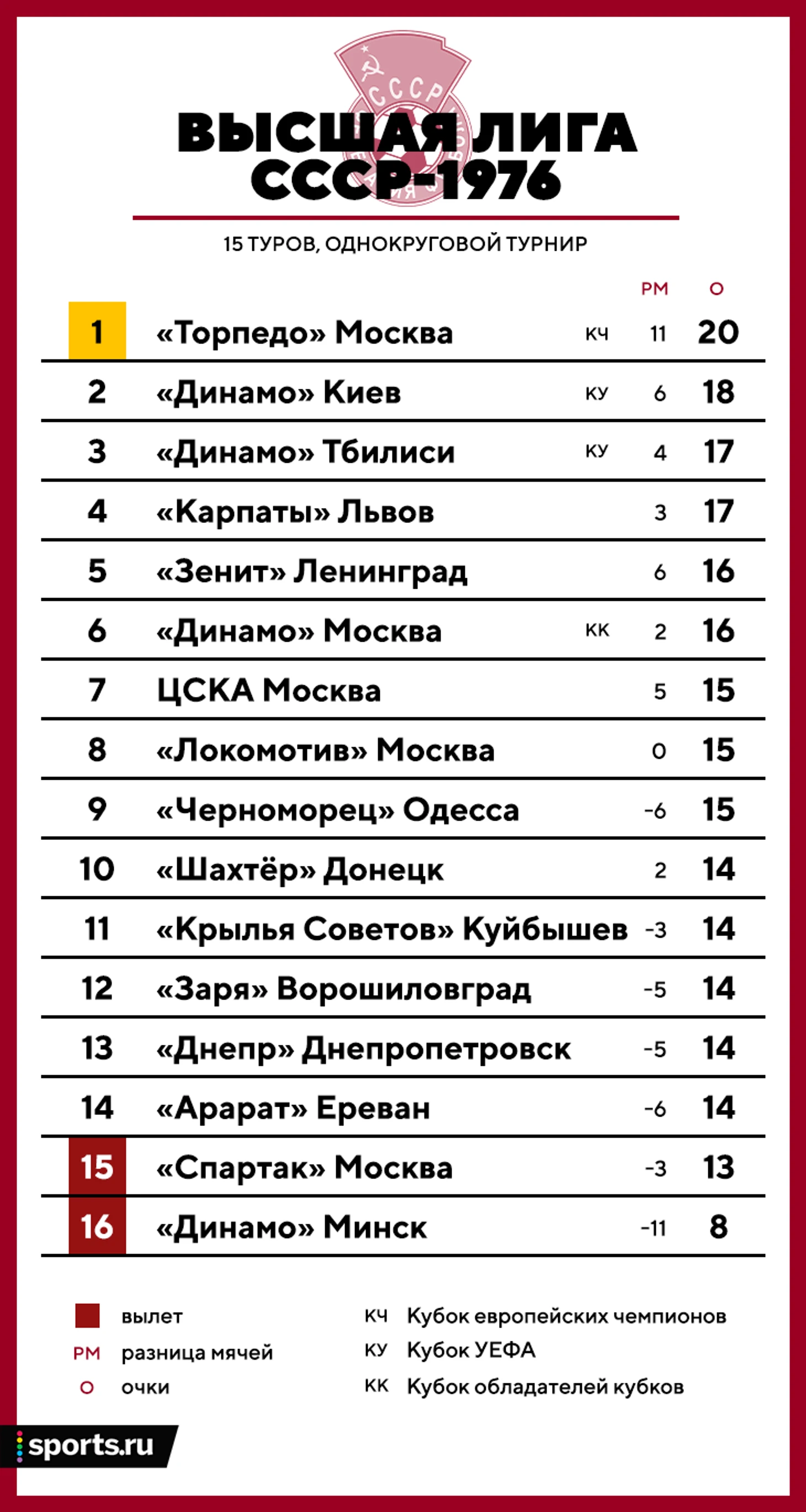 Холод и дождь заковали осенний футбол 1976-го в унылые рамки. Все команды глубоко оборонялись, надеялись на контратаки, футболисты утопали в болотистой жиже и только мечтали о зеленом газоне. «Спартак» тоже ставил армированную защиту, к середине октября шел пятым и даже выдержал натиск чемпионского «Торпедо» (2:2), но очень скоро все поменялось. Через пять дней красно-белые проиграли в Самаре, а в следующем туре Осянин за 9 минут до свистка оступился в своей штрафной и нормальная ничья с одесским «Черноморцем» превратилась в домашнее поражение от прямого конкурента.