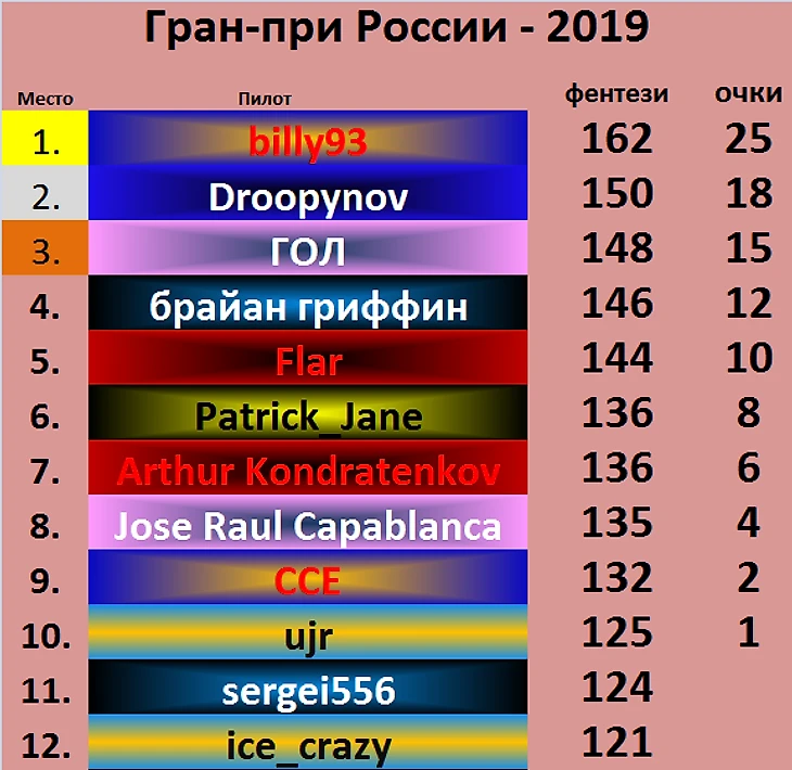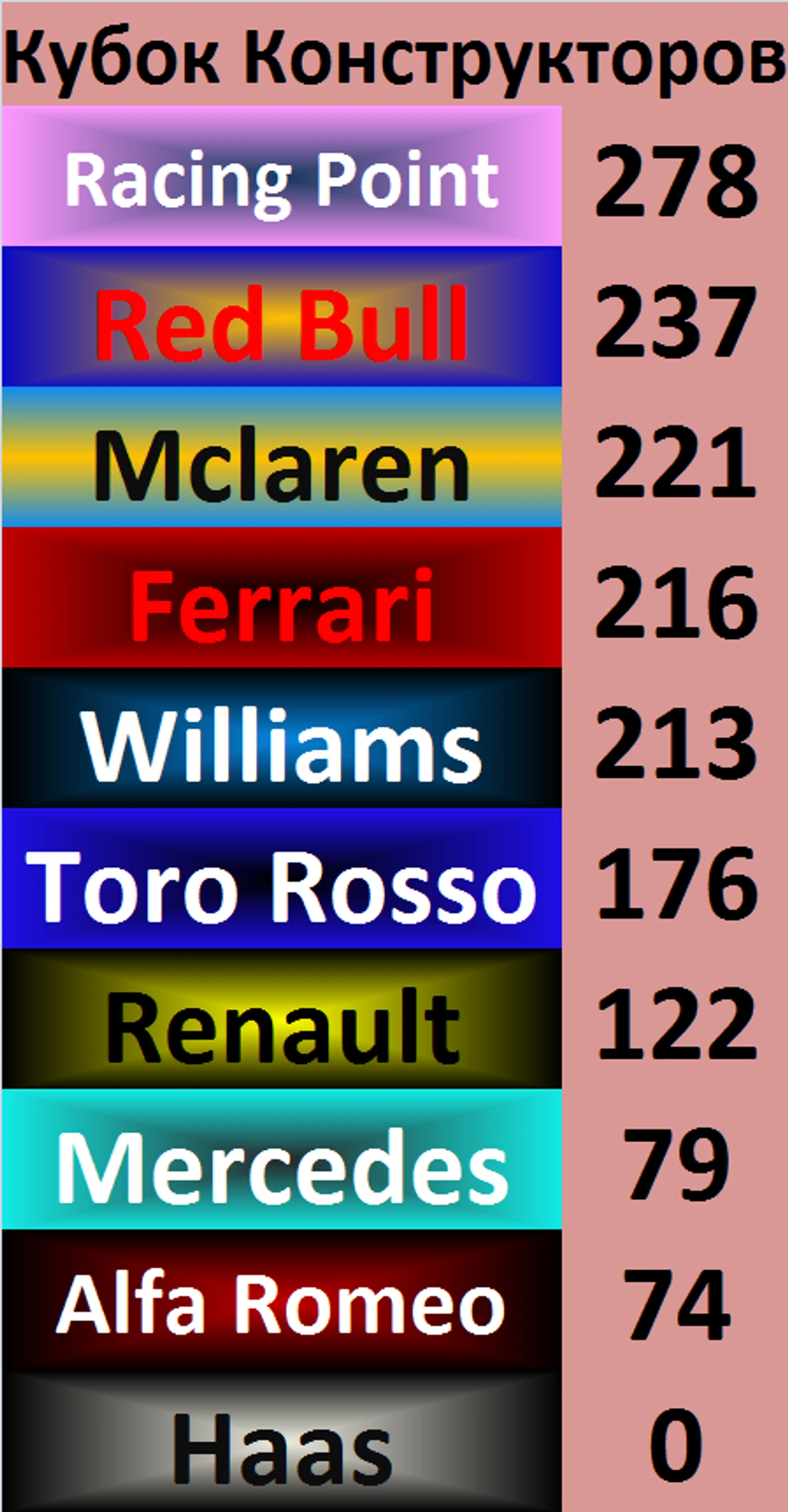 Пк Феттель лк Хэмильтон(5) Нп Гасли 1. Хэиильтон(25) 2.Леклер(18) 3.Феттель 4.Ферстаппен(25) 5. Боттас(12) 6.Албон(18) 7.Норрис(18) 8. Сайнс(15) 9.Риккиардо 10. Гасли(10)