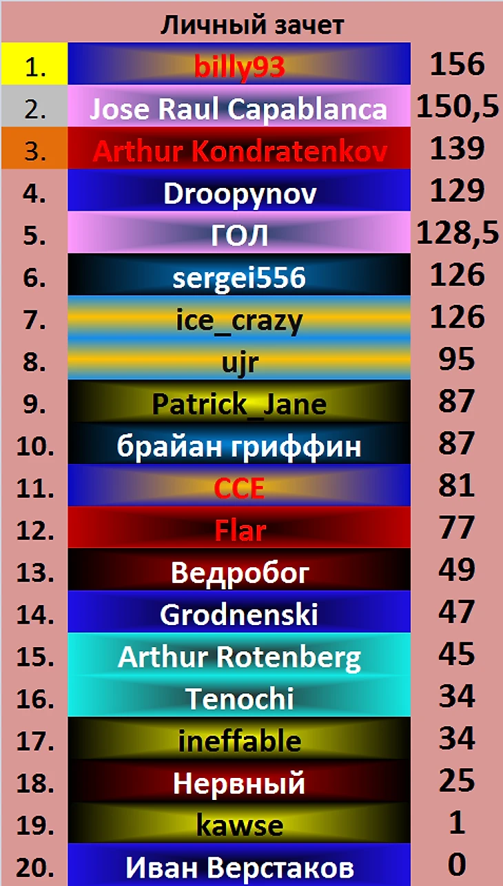 ПК-Леклер(5) ЛК-Ферстаппен НП-Квят 1.Леклер(15) 2.Феттель 3.Боттас(18) 4.Ферстаппен(18) 5.Хэмилтон(10) 6.Албон(18) 7.Перес(25) 8.Хюлкенберг(15) 9.Риккиардо 10.Райкконен(12)