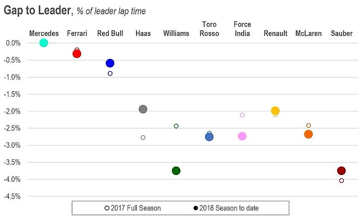 Для его построения Карун рассчитал среднее отставание от лидера для каждой команды на основе лучших квалификационных кругов по результатам двух Гран-при 2018 года. Как выяснилось, значительно подобрался к «Мерседесу» только «Хаас». «Ред Булл», «Рено» и «Заубер» лишь немного сократили отрыв. «Феррари», «Торо Россо» и «Макларен» остались примерно на том же сравнительном уровне, а «Уильямс» и «Форс-Индия» здорово отстали. Лидером остался «Мерседес».