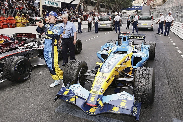 Первая из двух побед Алонсо в Монте-Карло мощно замешана на скандале. В тот сезон испанец ожесточенно боролся с Михаэлем Шумахером за чемпионство, но 36-летний немец уже переживал спад карьеры и потерял преимущество в технике. Тем временем после победы на домашнем Гран-при испанец оторвался уже на 15 очков в общем зачете, и Красному барону просто необходимо было отыграть в Монако ради сохранения притязаний на титул.