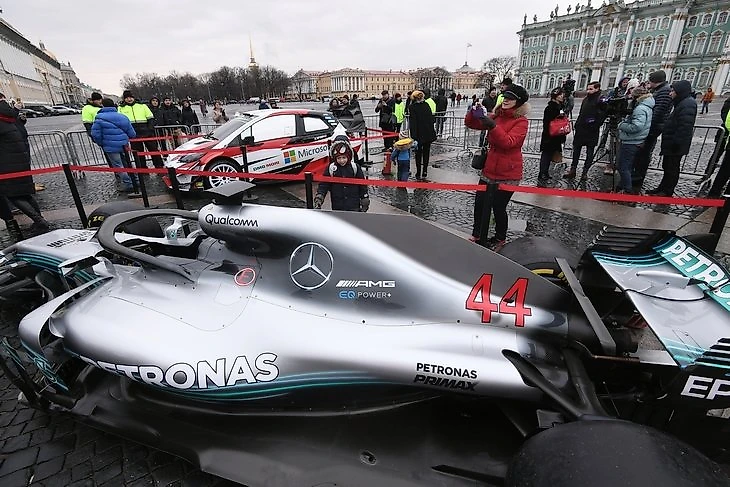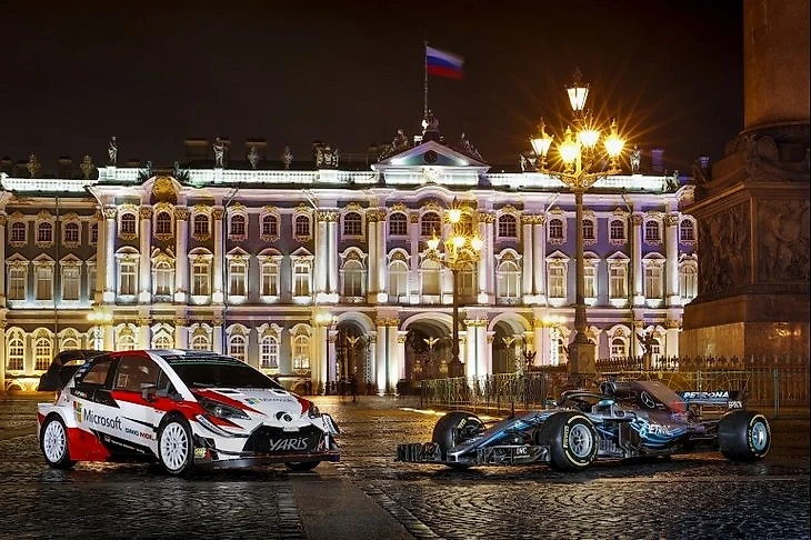 В тот же день на Дворцовой площади выставили победный болид «Мерседеса» W09 EQ Power+ и лучшую раллийную машину году «Тойоту Ярис WRC».