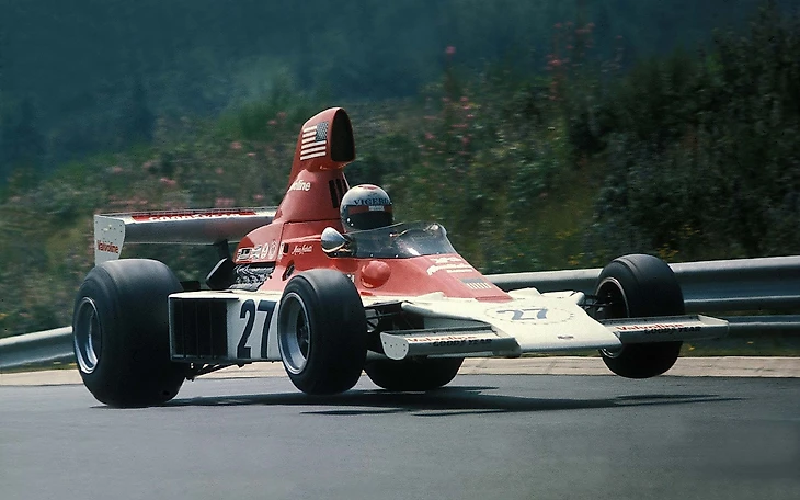 «Лотус 72Е» с прогрессивным носом и невероятно низким дорожным просветом был настоящим демоном прижимной силы своего времени. Даже здоровенный воздухозаборник-перископ был неповторимым, как и продуманная конструкция пластин заднего антикрыла. Тем не менее, это оказался последний сезон 72-го: после трех Кубков конструкторов из начала 70-х Жаки Икс (на фото) лишь раз поднялся на подиум.