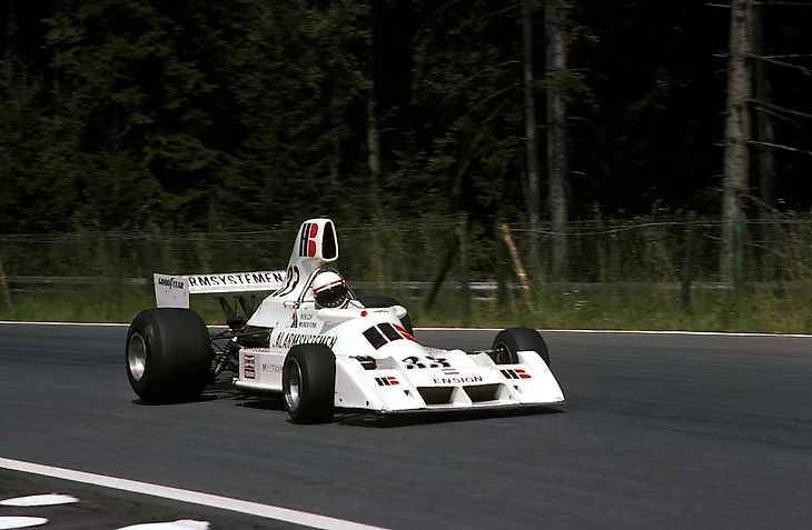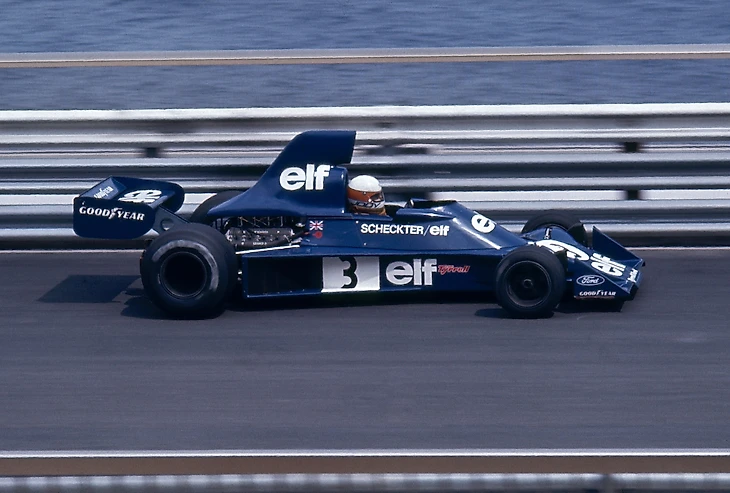«М23» с уменьшенным задним антикрылом и острыми пластинами на носу — это «Тиррелл 007». Его хватило на три сезона и три победы Джоди Шектера (на фото).