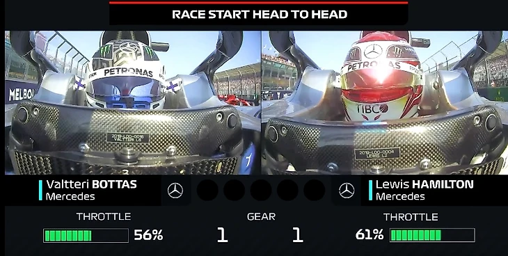 Оттереть Боттаса не получилось из-за более позднего разгона, и даже хорошая работа без пробуксовок на первой и второй передачах не спасла чемпиона — финн сделал то же самое на том же уровне и спокойно возглавил пелотон.