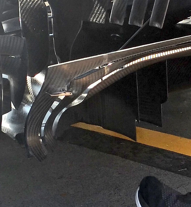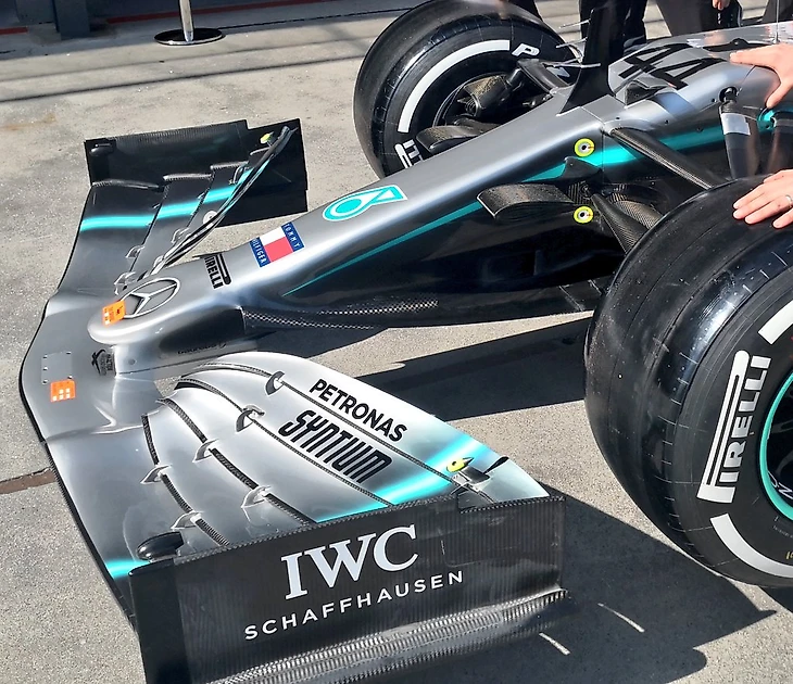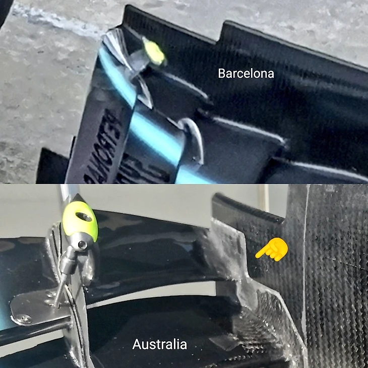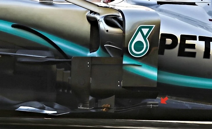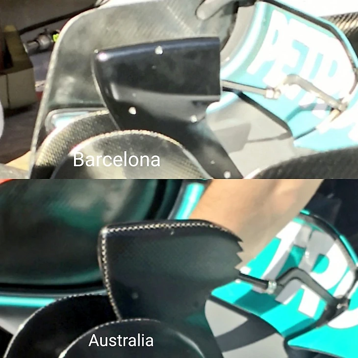 На вторых тестах в Барселоне «Мерседес» немного срезал верхнюю кромку боковой пластины по сравнению с первоначальной конструкцией. В Австралии тенденция продолжилась: немецкие конструкторы расположили ее немного ниже и еще немного обрезали. Таким образом данная деталь антикрыла лучше влияет на аэродинамический поток: задает ему более комфортную форму для обтекания и немного меняет «турбулентность» воздуха за передней шиной.