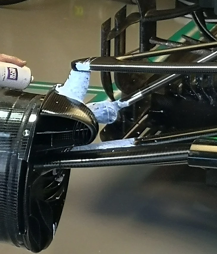 Множество команд нашло серую зону в регламенте на этом месте: например, такие же новинки в Австралию привезли «Рейсинг Пойнт» и «Макларен». «Мерседес» же добавил к нему еще и увеличенный в размерах воздуховод. Более того, судя по всему, немцы приспособили забирать из него поток для перенаправления прямо через ободы колес — фактически попытка обойти запрет на «продувные» системы. Решение теоретически тоже должно снизить эффект «грязного воздуха» от передних шин.