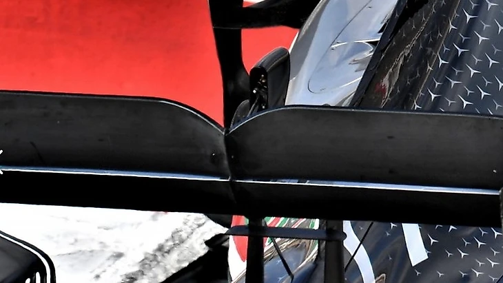 Новое зубчатое крепление ДРС вместе с пластинами установлено под небольшим углом специально для помощи активации/дективации системы. При нажатии на кнопку поднятия крыла машина обычно ловила момент мгновенного снижения прижимной силы — и то же самое происходило при закрытии в точке торможения. Такой эффект портил баланс болида и мог вызвать непредсказуемые аэродинамические артефакты. Новые пластины благодаря углу наклона минимизируют время переходного периода из открытого в закрытое состояние, убирая негативные эффекты и связанные с ними риски.