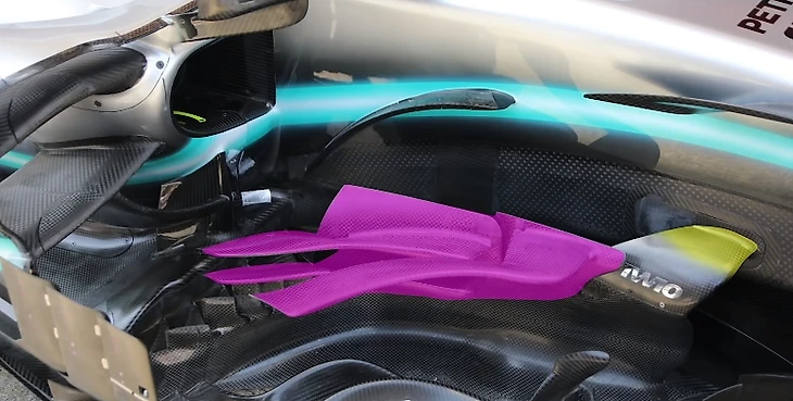 Новое решение со «спаянными» пластинами подсмотрели у «Ред Булл» – австрийцы представили его на Гран-при Бахрейна. Оно помогает усилить вихрь Y250 – ключевой элемент аэродинамического пакета «Мерседеса».