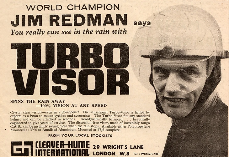 В экипировке старого образца не было визора, и лицо пилота под дождем обычно заливали капли осадков и брызги из-под колес следующих впереди машин. Чтобы избегать этого, пилоты изобрели турбо-визор, вертевшийся перед лицом из-за силы встречных воздушных потоков, собиравший капли воды и направлявший в одну точку. Устройство применялось вплоть до начала 70-х, пока не появились закрытые шлемы, похожие на современные.