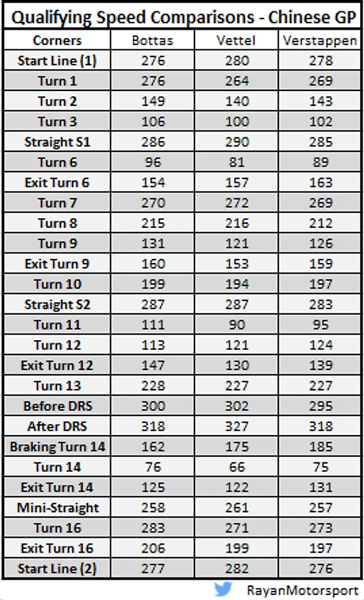 В зоне торможения после самой длинной прямой трека (и одной из самых длинных во всей «Формуле-1») Макс выиграл у Боттаса на «Мерседесе» и Феттеля на «Феррари» 23 и 10 км/ч соответственно — следовательно, пилот «Ред Булл» нажал на педаль значительно позже всех соперников, но все равно сумел вовремя сбросить скорость и завернуть в поворот.