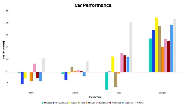 Зато W10 отыгрывается в быстрых поворотах с максимальной прижимной силой — там преимущество «серебряных» и «Хааса» составляет примерно 0,3 секунды. Поражает и эффективность «Макларена»: англичане заняли третье место по этому показателю и обогнали гигантов «Феррари» и «Ред Булл».