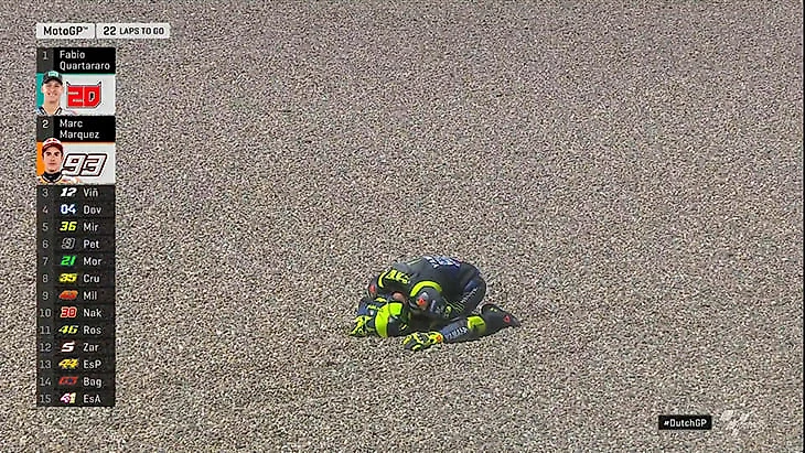 Второй раз произошел 16 июня — на сей раз Вале не смог увернуться от байка соперника и отправился в гравий вместе с другими лидерами Гран-при Каталонии.