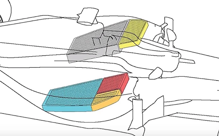 Охлаждающие элементы в «Формуле-1» чаще всего располагаются под углом — специально, чтобы в небольшой боковой понтон можно было запихать устройство побольше. И с лицевой стороны она будет выглядеть вот так.