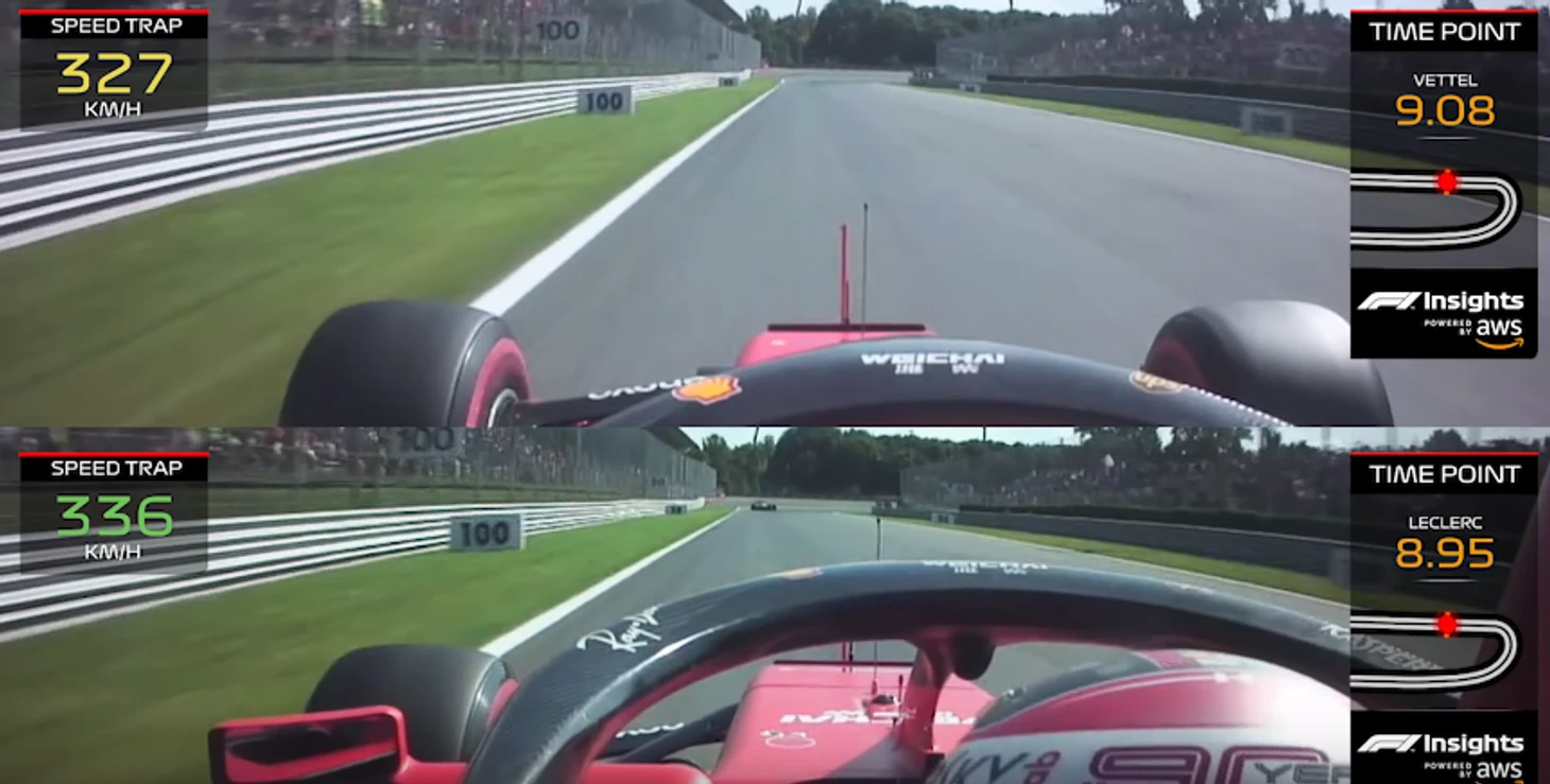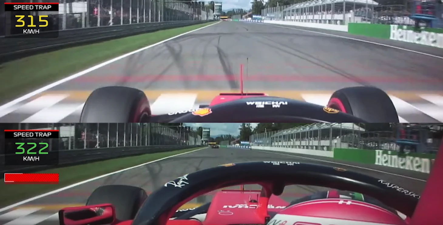 Как видим, в начале последней прямой у Феттеля без слипстрима была скорость в 286 км/ч, а у Леклера со слипстримом — 285 км/ч. После 327 и 336 км/ч соответственно.