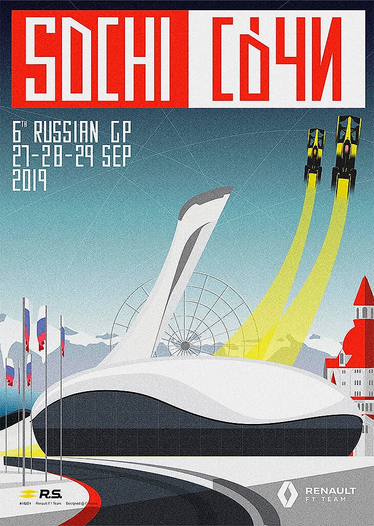 27 cентрября в Сочи стартует первый день Гран-при России – естественно, в его честь несколько команд нарисовали специальные постеры, анонсирующие очередной этап «Формулы-1». Первыми в сеть немного искусства выложила «Рено».