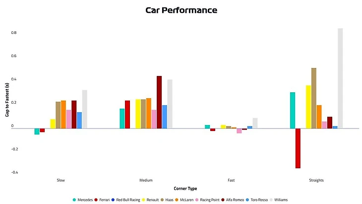 (Бирюзовый столбик – «Мерседес», красный – «Феррари», желтый – «Рено», оранжевый – «Макларен», розовый – «Рейсинг Пойнт», бордовый – «Альфа Ромео», голубой – «Торо Россо», серый – «Уильямс», отрывы сформированы по отношению к «Ред Булл»).