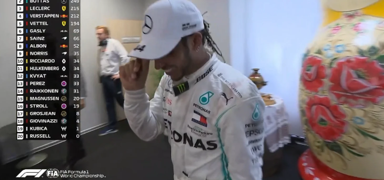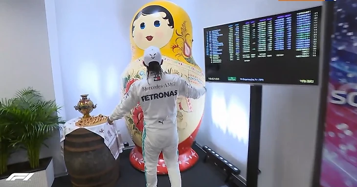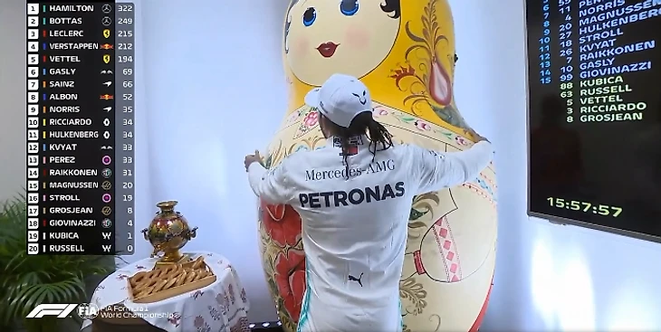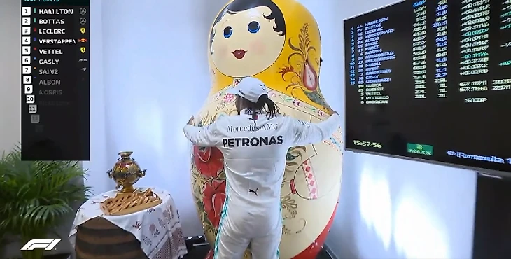Хэмилтон отпраздновал победу на Гран-при России обнимашками с огромной матрешкой