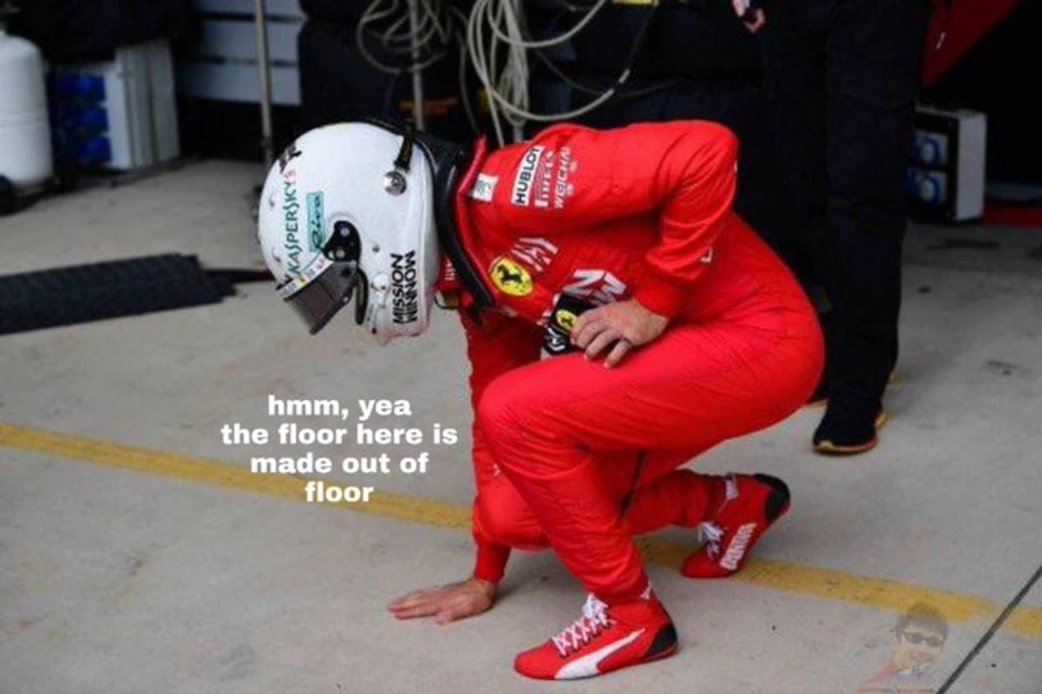 К слову, шпионажем за одним лишь болидом Себ не ограничился: еще перед квалификацией он зачем-то устроил инспекцию покрытию в паддоке «Феррари».