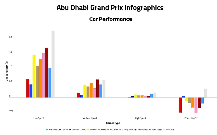 Красный столбик – «Феррари», синий – «Ред Булл», желтый – «Рено», оранжевый – «Макларен», розовый – «Рейсинг Пойнт», бордовый – «Альфа Ромео», голубой – «Торо Россо», серый – «Уильямс», отрывы сформированы по отношению к «Мерседесу»).