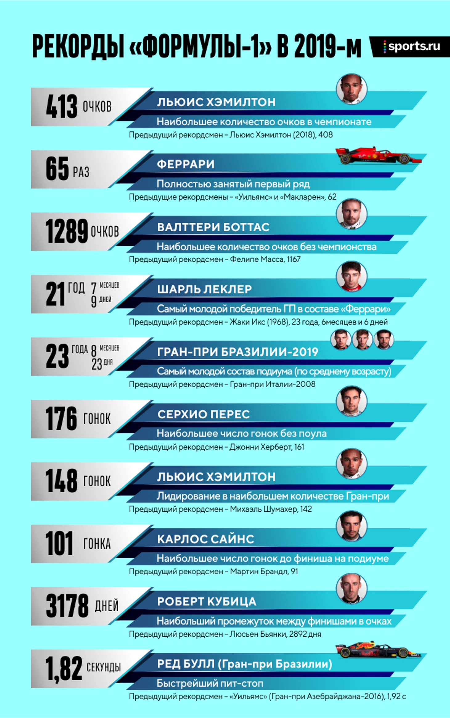 «Формула-1» в 2019-м прежде всего запомнилась драмой в большинстве гонок, доминированием «Мерседеса» в результатах и закреплению Льюиса Хэмилтона на втором месте в списке самых титулованных пилотов в истории. Но минувший сезон войдет в статистические рейтинги не только благодаря шестому титулу англичанина: за 21 Гран-при последних 9 месяцев побили сразу 10 рекордов серии.