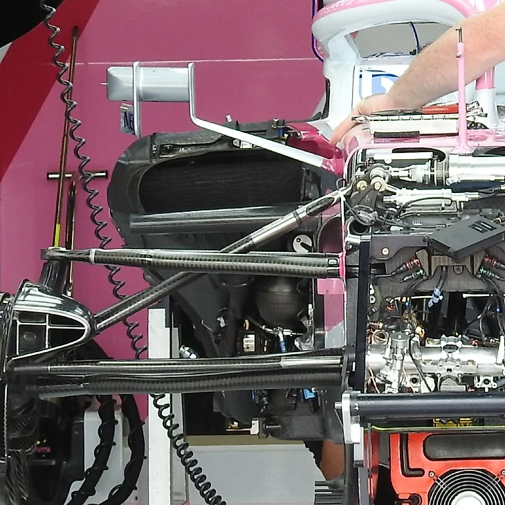 К слову, она выглядит грозно в смысле борьбы за корону середины пелотона: судя по всему, «Рейсинг Пойнт» достался кинематически-гидравлический «толкатель», меняющий дорожный просвет в поворотах больше 210 градусов (тем самым нагрузка перераспределяется равномернее, внешнее колесо избегает блокировки и шина на ней дольше не изнашивается). Именно эту систему считают одним из главных факторов победы «Мерседеса» в чемпионате 2019 года – да и сейчас подобные есть только у «Феррари» и «Ред Булл».
