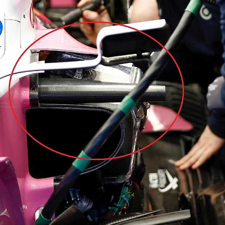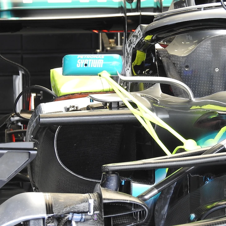 При разборке бокового понтона видно, что воздухозаборник особой формы (такой был только у «Мерседеса» в 2019-м) помещается довольно низко и под структурой безопасности ФИА.
