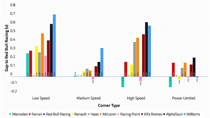 «Мерседес» в то же время потерял 0,3 секунды в медленных поворотах и лишь чуть-чуть нагнал в среднескоростных – правда, «Ред Булл» там потерял лидерство в пользу «Рейсинг Пойнт». В высокосротных виражах отрыв чемпионов уменьшился с 0,23 секунды до 0,12 – с учетом остального прогресса теперь быстрешим во всех типах поворотов можно считать именно RB19.