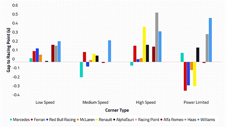 Бирюзовый столбик – «Мерседес», красный столбик – «Феррари», синий – «Ред Булл», желтый – «Рено», оранжевый – «Макларен», бордовый – «Альфа Ромео», голубой – «Уильямс» серый – «Хаас» белый – «Альфа Таури», отрывы сформированы по отношению к «Рейсинг Пойнт»).