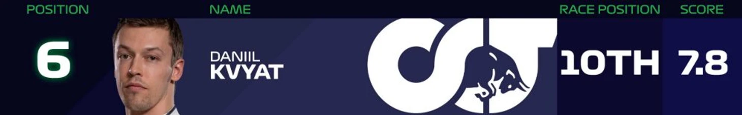 Рейтинг Гран-при 70-летия оказался вот таким: Даниил Квят вошел в топ-10 рейтинга и оказался выше сразу двоих пилотов из четверки лучших по сезону.